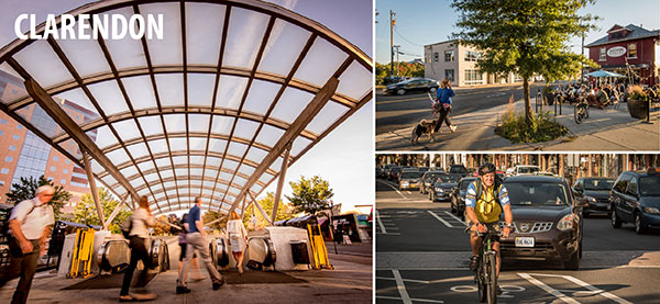 Clarendon offers a mix of retail, restaurants, residential properties, and office buildings on the Wilson Boulevard - Clarendon Boulevard - Orange/Silver Line corridor in Arlington. Clarendon Metro station is served by Metrorail's Orange and Silver Lines, and the area is served by several ART and Metrobus routes. Clarendon is very walkable and bikeable, with pedestrian signals at every intersection, on-street bike lanes, and Capital Bikeshare stations. Development is concentrated near the Metro, with single-family homes — and quiet streets — just a block away. The Custis Trail is about a mile from the Metro station.